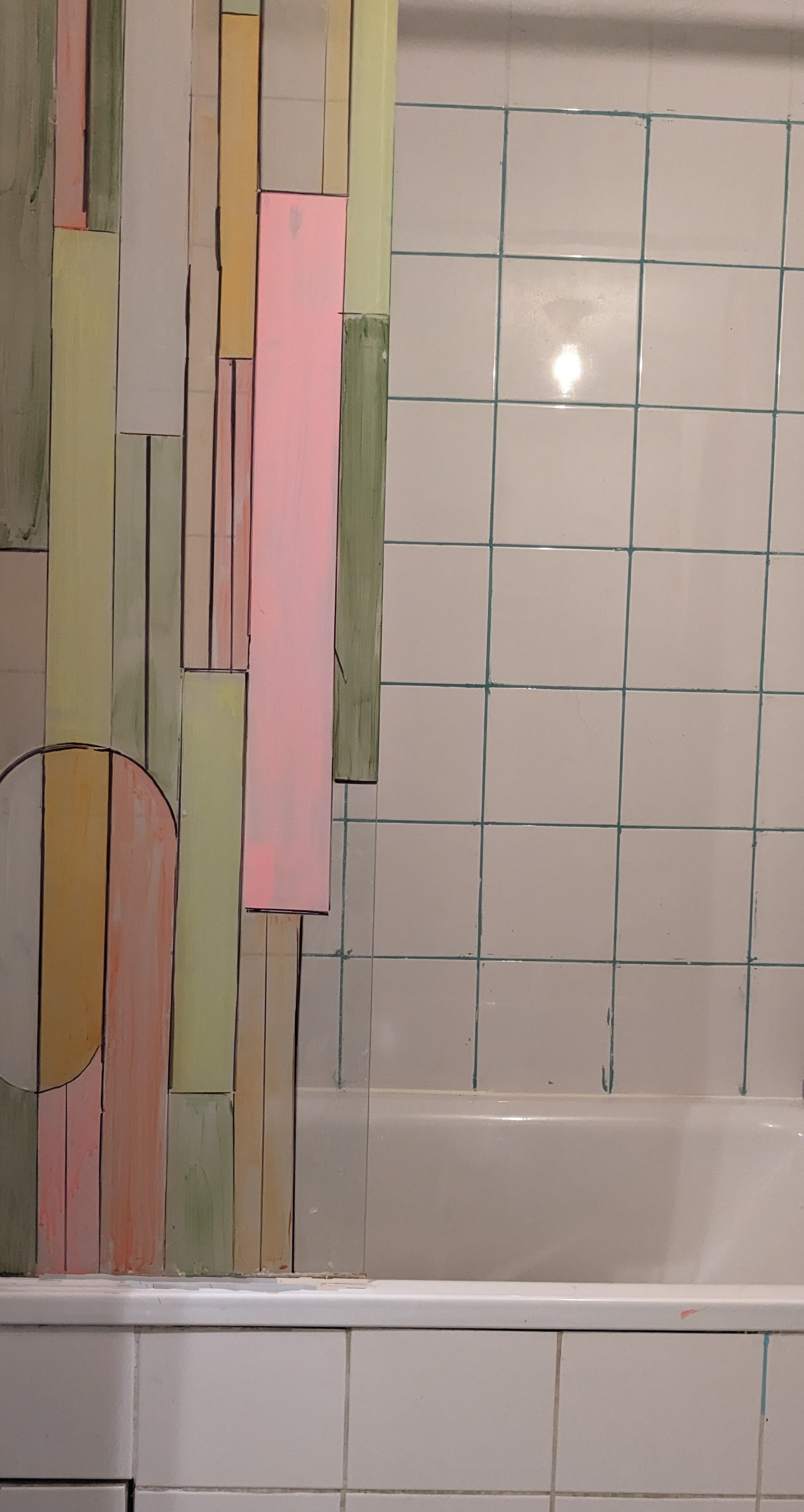 Dans le petit espace de la salle de bain, le projet était de créer une séparation décorative pour aider à l’intimité de la douche dans cet appartement familial.